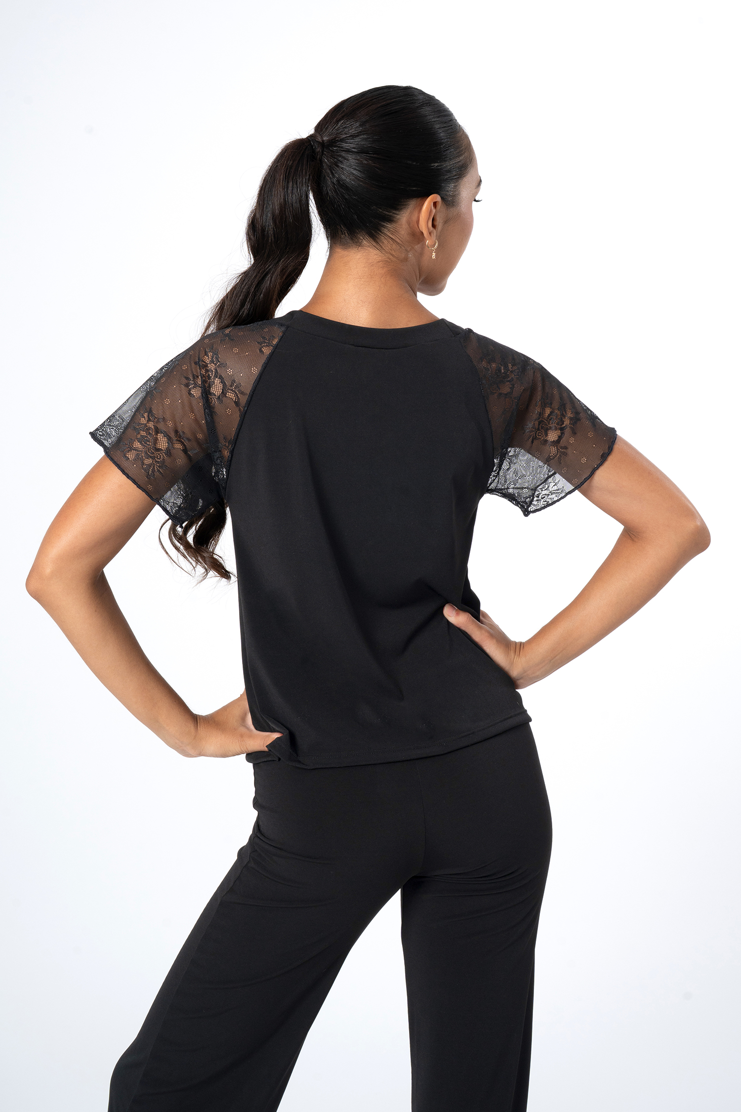 Damen Tanzoberteil mit kurzen Ärmeln aus Spitze. Schwarz, weich, atmungsaktiv und knitterarm.