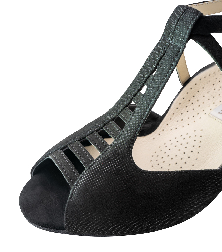 Tanzschuhe Damen offen aus schwarzem Veloursleder und Glanzvelour. Der nach oben schmaler werdende T-Steg kleidet den Fuß geschickt. 4,5 cm hoher bequemer leicht ausgestellter Absatz. Individuell einstellbares überkreuztes Ristriemchem mit Druckknopf - Verschluss. Atmungsaktive Leder - Innensohle. Griffige Rauledersohle.