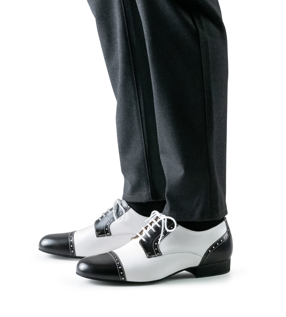 Tanzschuhe Herren im Vintage Look aus weichem schwarzen und weißen Nappaleder. 2,0 cm hoher Absatz mit Fersendämpfung. Budapester mit 5 - Loch Schnürung. Atmungsaktive Leder - Innensohle. Griffige Rauledersohle.