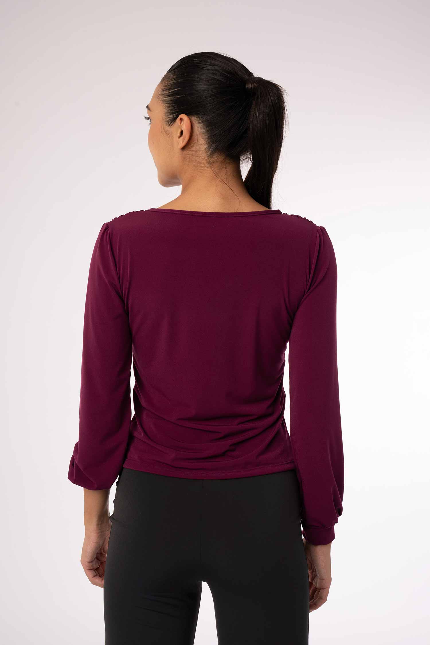 Women’s dance top with long sleeves. Berry, soft, breathable, and wrinkle-resistant.