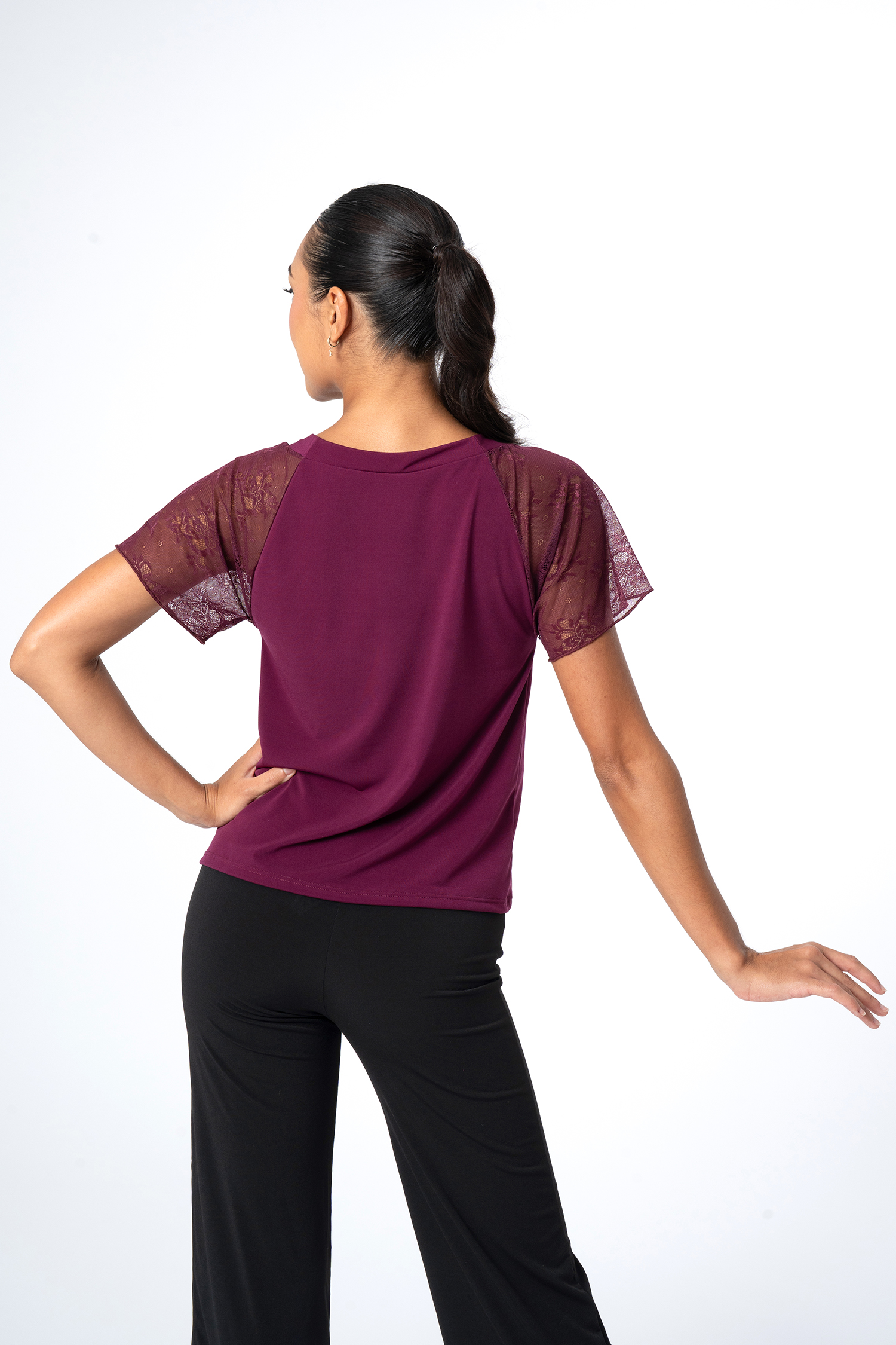 Women’s dance top with short lace sleeves. Berry-colored, soft, breathable, and wrinkle-resistant.